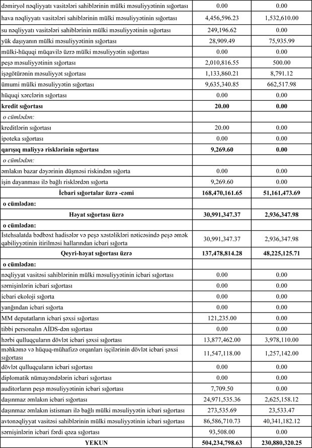 Cari ilin müvafiq dövrü ərzində sektor üzrə məcmu sığorta haqlarının 67%-i könüllü, 33%-i icbari sığorta növlərinin payına düşüb. Sığorta ödənişlərinin isə 78 %-i könüllü, 22%-i icbari sığorta növlərinin payına düşüb.