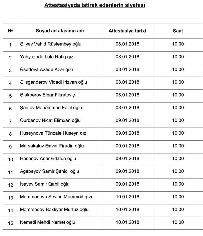 Attestasiyada iştirak edənlərin siyahısı əlavə olunur.