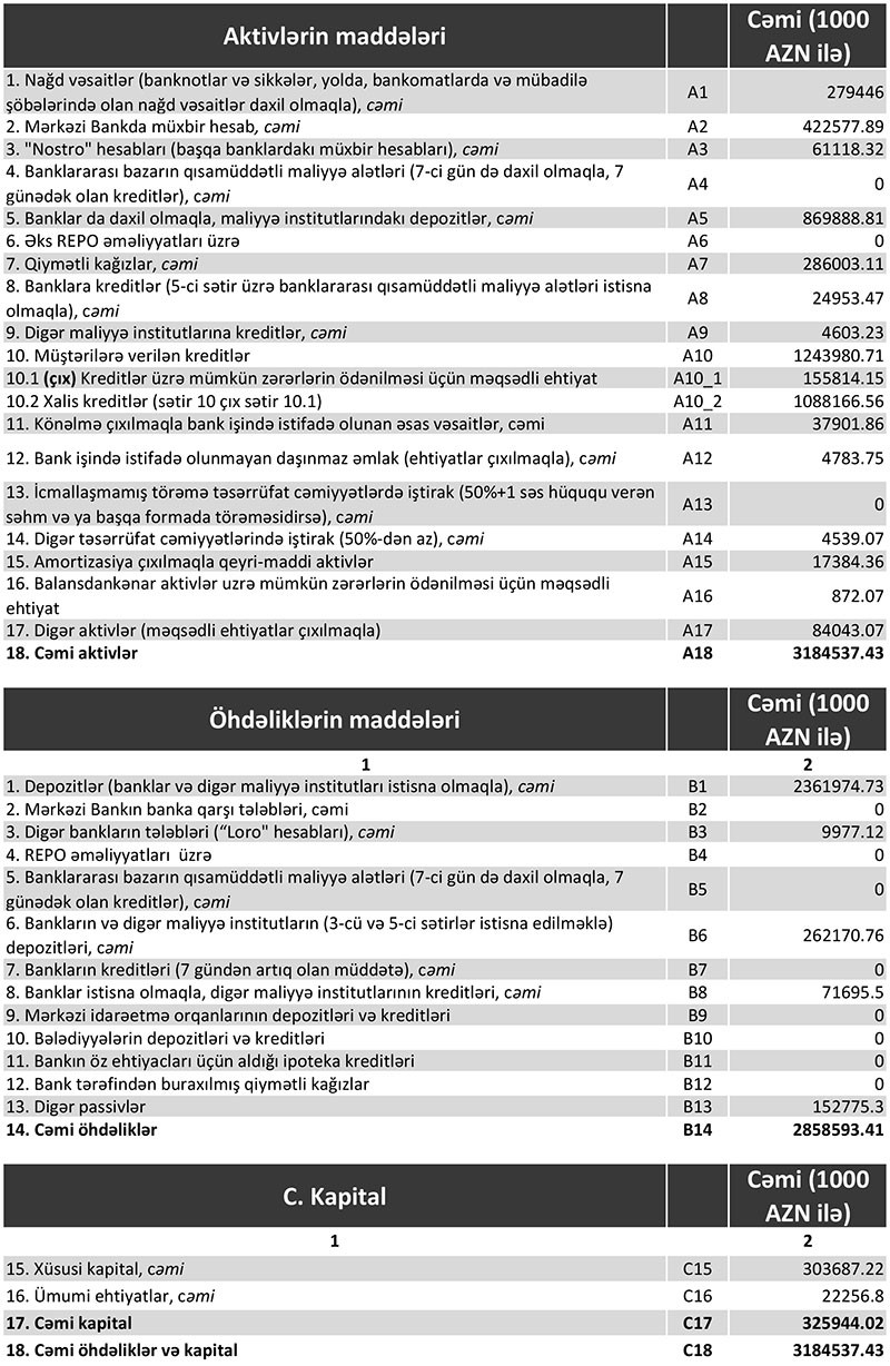 Bankın 1 yanvar 2018-ci il tarixinə tutulmalardan sonra məcmu kapitalı 299,9 milyon manat, nizamnamə kapitalı isə 185,9 milyon manat təşkil edir