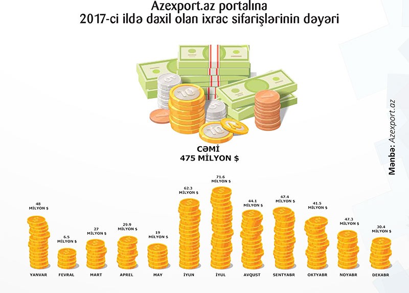 2017-ci il ərzində Azexport.az portalına dünyanın 74 ölkəsindən 475 milyon ABŞ dolları məbləğində ixrac sifarişləri daxil olmuşdur.