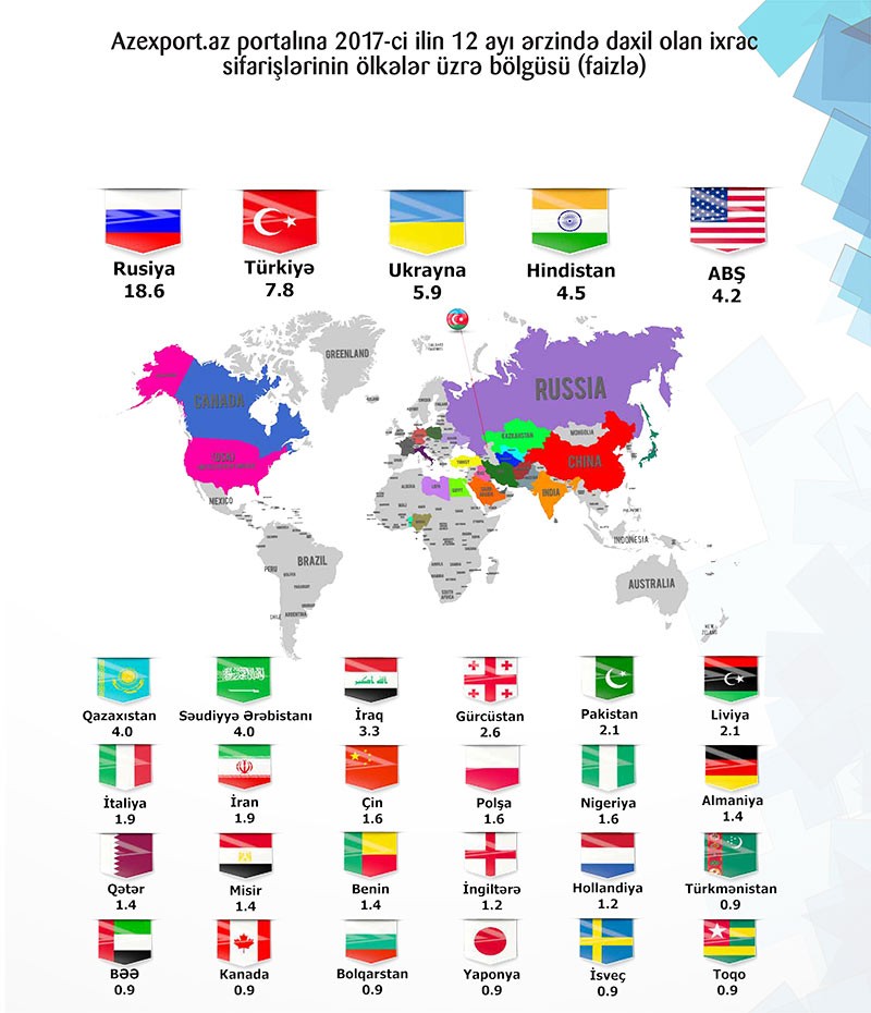 Portala daxil olan ixrac sifarişlərinin ilk beşliyində Rusiya (18.6 %) ilə yanaşı, Türkiyənin (7.8%), Ukraynanın (5.9%), Hindistanın (4.5%) və ABŞ-ın (4.2%) adı vardır. Dekabr ayında Çili, Livan kimi yeni ölkələrdən ixrac sifarişi daxil olmuşdur.