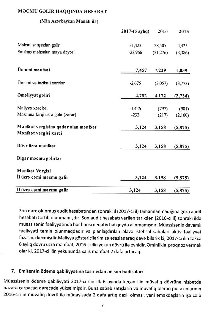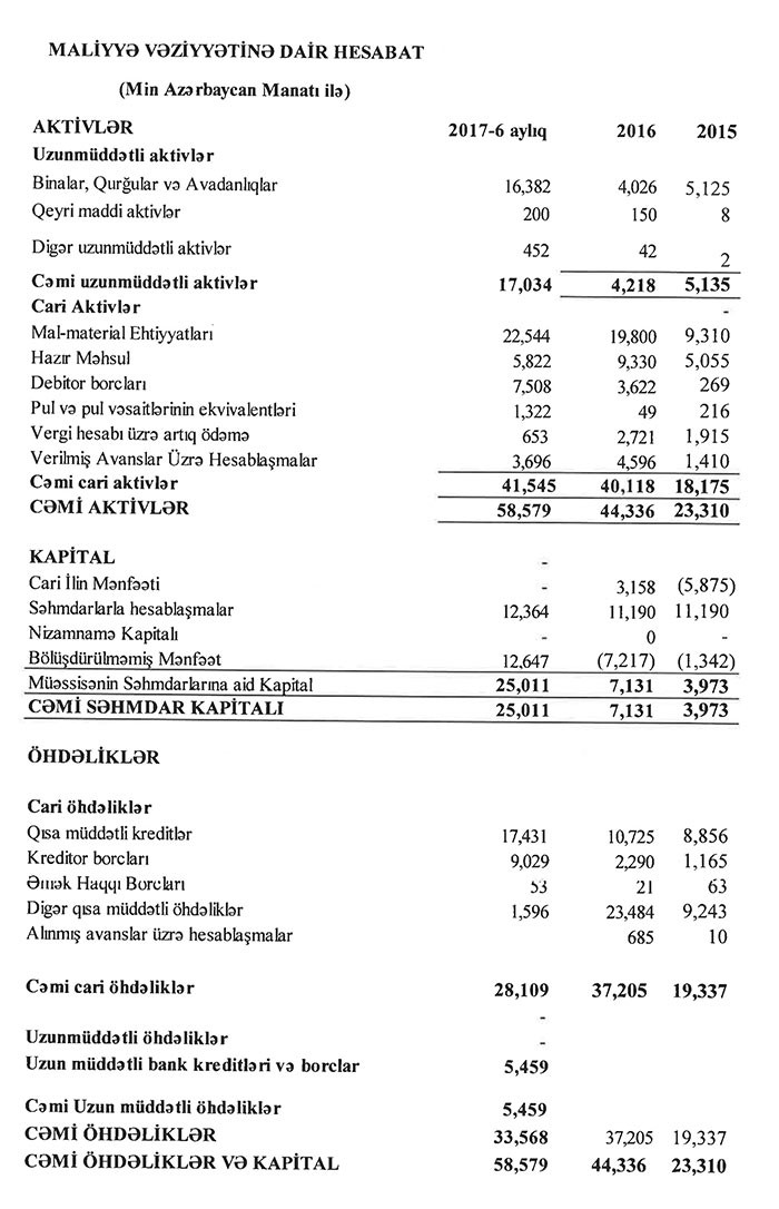 2016-cı ili 3 milyon 158 min manat xalis mənfəətlə başa vurmuş şirkət, 2017-ci ilin birinci yarısını 3 milyon 124 min manat xalis mənfəətlə bağlayıb. Şirkət 2015-ci ili 5 milyon 875 min manat zərər ilə başa vurmuşdu.