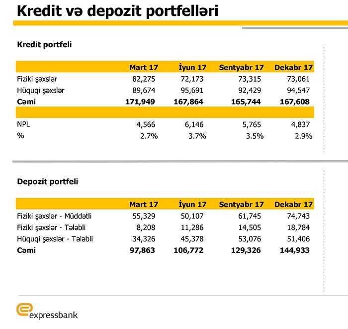 "Marja" xəbər verir ki, 2016-cı ilin sonunda "Expressbank"da fiziki şəxslərin müddətli əmanətləri 60 milyon 368 min manat təşkil etmişdi. 2017-ci ilin birinci yarısında əmanətlər azalmış, 30 İyun 2017-ci il tarixində 50 milyon 107 min manata düşmüşdü.