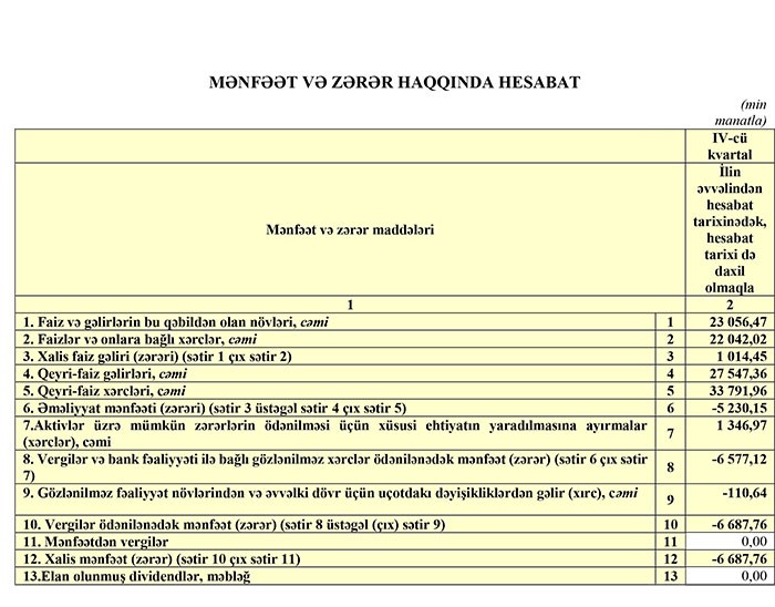 Ötən il Bankın cəmi gəlirləri 50 milyon 603 min manat, o cümlədən faiz gəlirləri 23 milyon 56 min manat, qeyri-faiz gəlirləri 27 milyon 547 min manat təşkil edib. Bankın faiz və qeyri-faiz xərcləri cəmi gəlirlərindən çox (55 milyon 833 min manat) olduğundan 5 milyon 230 min manat əməliyyat zərəri yaranıb. Bundan başqa, aktivlər üzrə mümkün zərərlərin ödənilməsi üçün xüsusi ehtiyatın yaradılmasına 1 milyon 347 min manatlıq ayırma zərəri daha da artırb və 6 milyon 688 min manata çatıb.