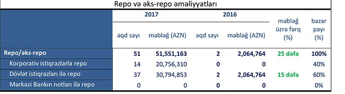 Hesabat dövrü ərzində repo əməliyyatlarının ümumi məbləği ötən ilin müvafiq dövrü ilə müqayisədə 25 dəfə artaraq 51,5 mln. manat olmuşdur. Dövlət istiqrazları ilə ümumi məbləği 30.8 mln. manat olan 37 repo əməliyyatı, korporativ istiqrazlarla isə 20,8 mln. manat məbləğində 14 repo əməliyyatı keçirilmişdir.