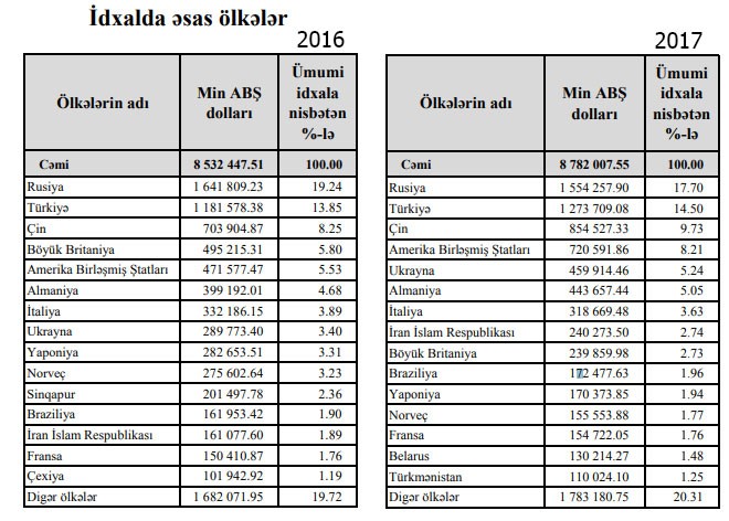 2016-cı illə müqayisədə 2017-ci ildə Azərbaycanın ən çox mal aldığı 15 ölkə siyahısından Sinqapur və Çexiya çıxıb. Əvəzində isə Belarus və Türkmənistandan daha çox mal almağa başlamışıq.