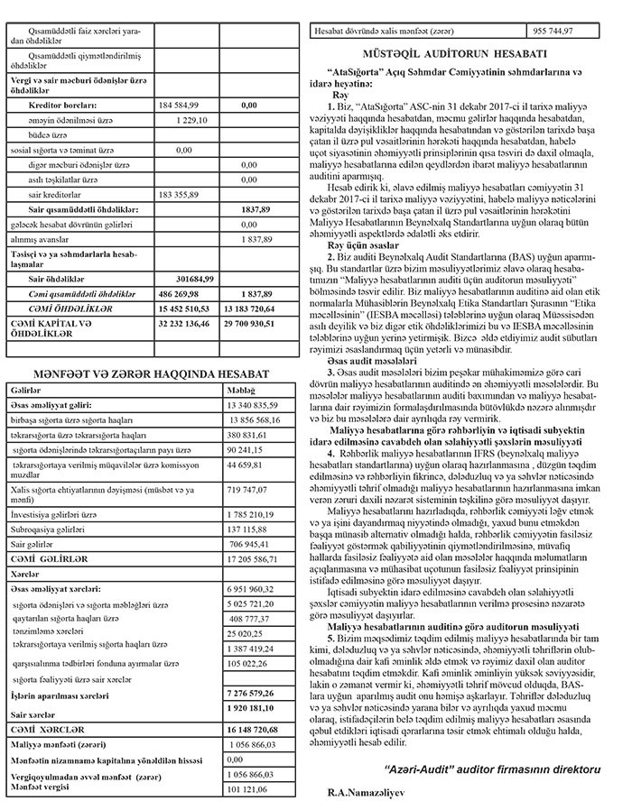 Aqressiv satışlara, yeni filialların açılmasına baxmayaraq ötən il “AtaSığorta”nın qazancı artmayıb. “AtaSığorta” ASC 2017-ci ili 955 min 745 manat xalis mənfəətlə başa vurub.