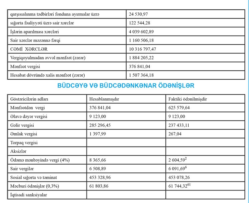 Ötən il “Xalq Sığorta”nın cəmi gəlirləri 12 milyon 201 min manat, cəmi xərcləri 10 milyon 317 min manat, ödənilmiş mənfəət vergisi 376 min 841 manat təşkil edib.