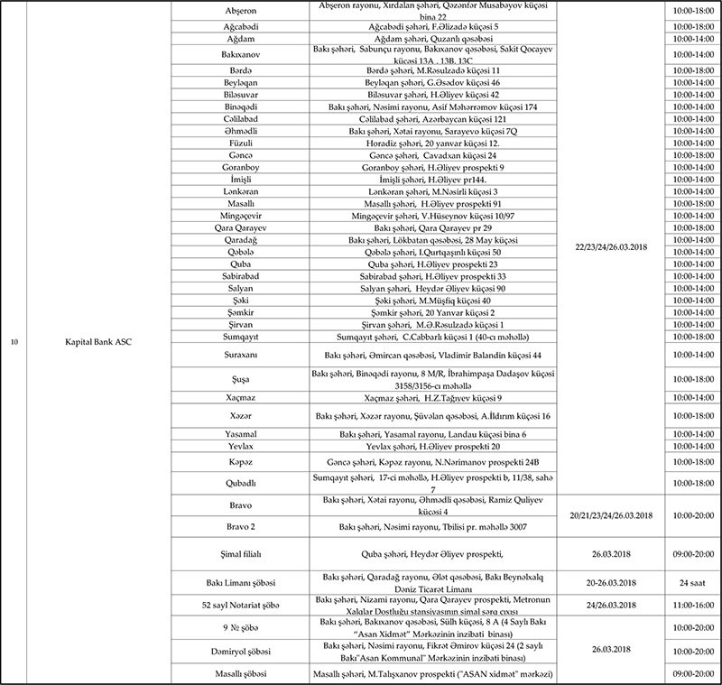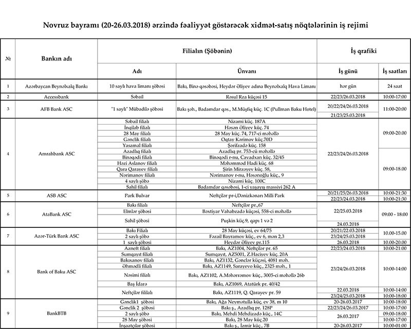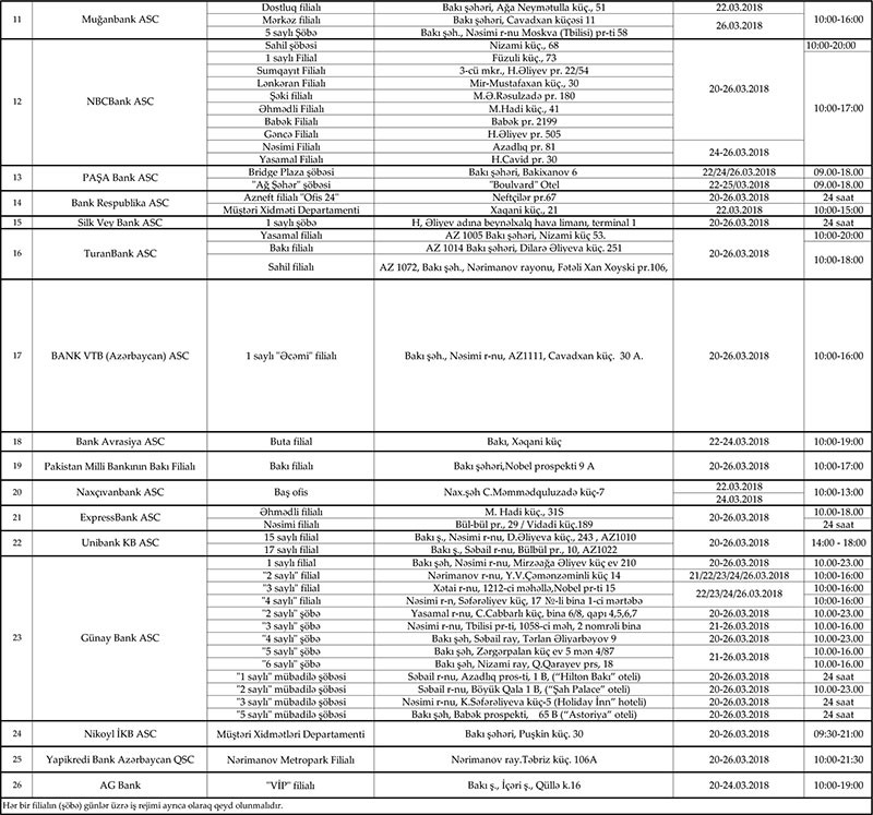 20-26 mart tarixlərində çalışacaq bank filial və şöbələrinin siyahısı