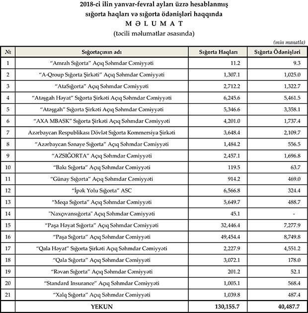 2018-ci ilin yanvar-fevral ayları ərzində ölkədə fəaliyyət göstərən 21 sığorta şirkəti tərəfindən 130.2 mln. manat məbləğində sığorta haqları toplanmış, 40.5 mln. manat məbləğində sığorta ödənişi aparılmışdır.