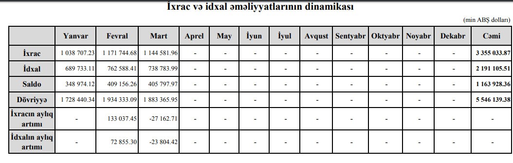 Martda ixrac 1 milyard 144 milyon 581 min dollar, idxal isə 738 milyon 783 min dollar təşkil edib.