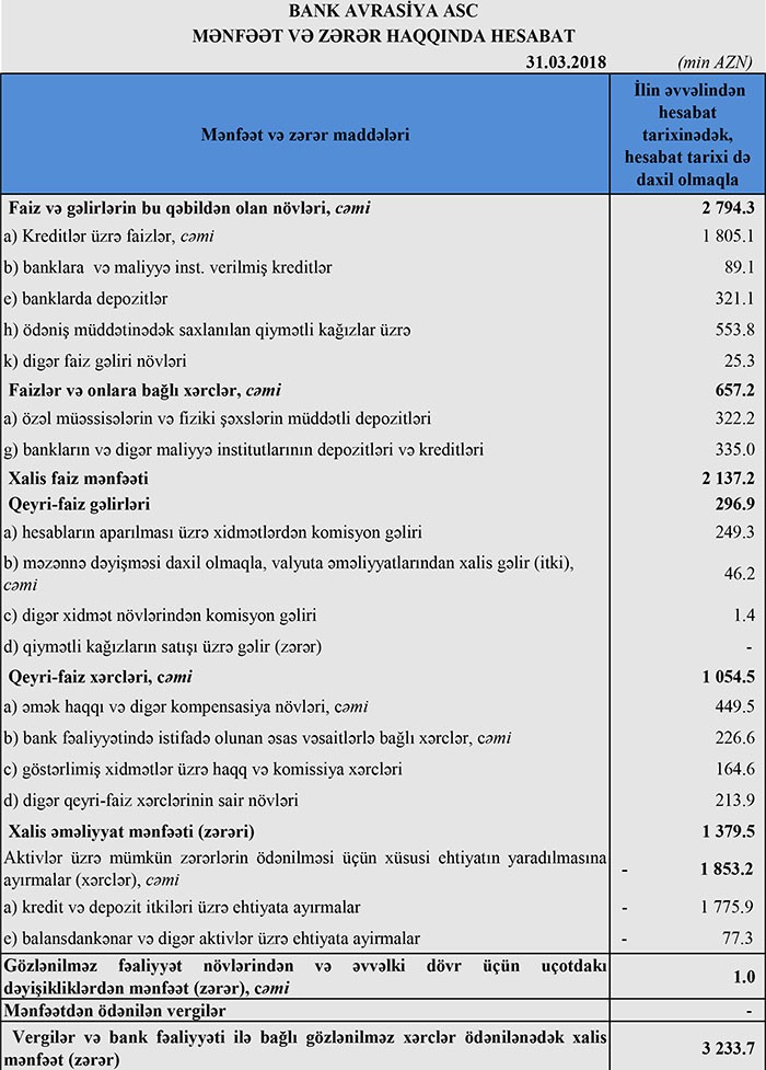 “Bank Avrasiya” ASC 2018-ci ilin 1-ci rübünü 3 milyon 233.7 min manat xalis mənfəətlə başa vurub.