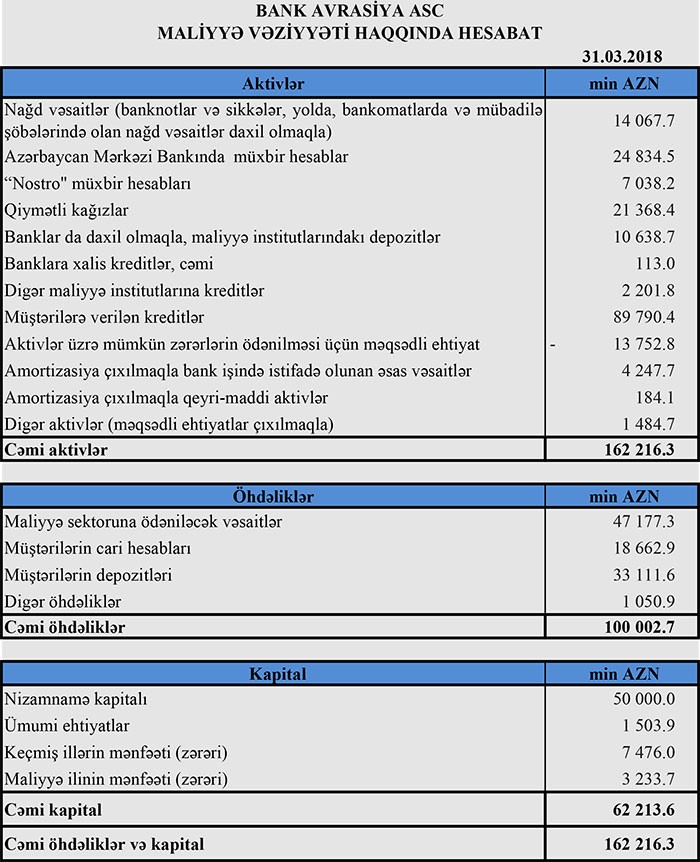 "Bank Avrasiya" ASC 31.03.2018-ci il tarixində 162 milyon 216 min manat cəmi aktivlərə, 100 milyon 2.7 min manat cəmi öhdəliklərə və 62 milyon 213.6 min manat cəmi kapitala malik olub. Bank ötən ilin sonunda 151 milyon 223 min manat cəmi aktivlərə, 92 milyon 311 min manat cəmi öhdəliklərə və 58 milyon 912 min manat cəmi kapitala malik idi.