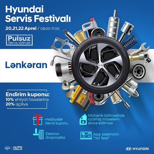 Servis festivalında bütün “Hyundai” markalı avtomobillərə bir çox servis xidmətləri pulsuz və ya endirimlə göstəriləcəkdir.