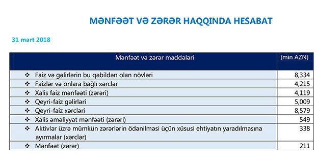 Müqayisə olunana dövrdə, Bankın faiz gəlirləri 7 milyon 931 min manatdan 8 milyon 334 min manata qalxıb, qeyri-faiz gəlirləri isə 7 milyon 247 min manatdan 5 milyon 9 min manata düşüb.