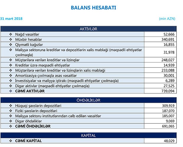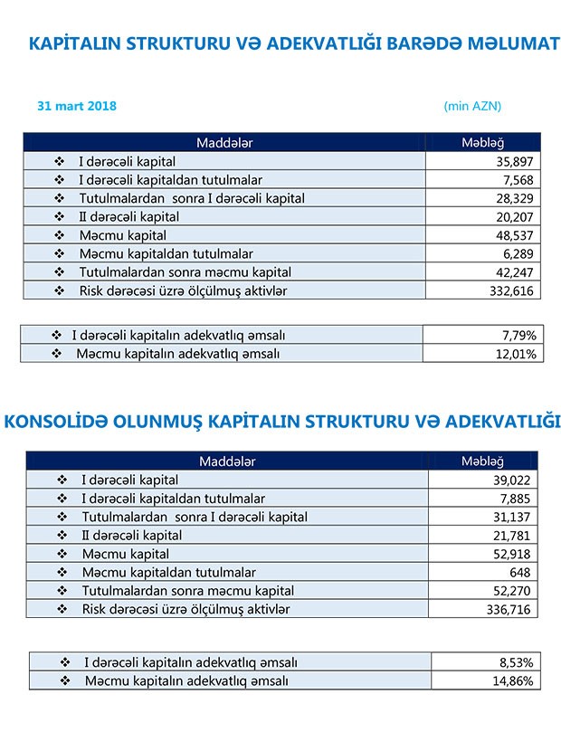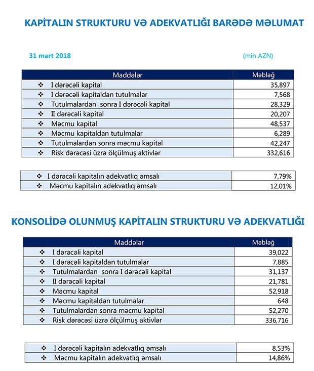 İlk rübdə Bankın məcmu kapitalı 10 milyon 330 min manat artaraq 48 milyon 29 min manata çatıb.