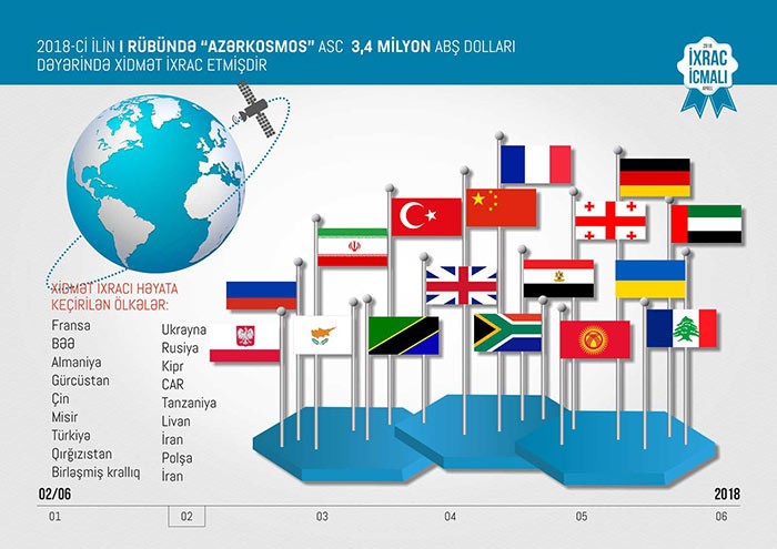 Göstərilib ki, 2018-ci ilin I rübündə “Azərkosmos” ASC tərəfindən dünyanın 18 ölkəsinə peyk və telekommunikasiya xidmətləri ixrac edilib. Cari ilin ilk 3 ayında “Azərkosmos” ASC peyk və telekommunikasiya xidmətlərinin ixracından 3,4 milyon ABŞ dolları məbləğində gəlir əldə edib. “Azərkosmos” ASC-nin xidmət ixracından əldə etdiyi gəlir onun ümumi gəlirlərinin 86 faizini təşkil edib.