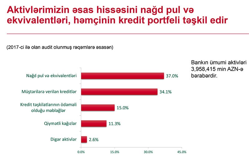 Konsolidə edilmiş 1 miyard 413 milyon manatlıq kredit portfelinin 1 milyard 250 milyon manatını hüquqi şəxslərə verilmiş kreditlər təşkil edib. Ən çox kreditlər ticarət və xidmət sektorlarına verilib.