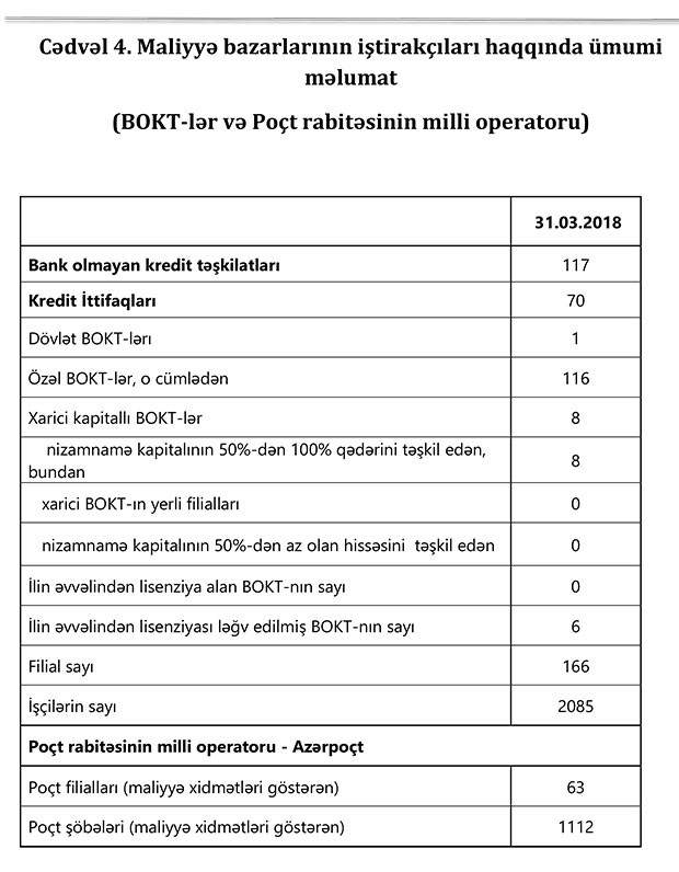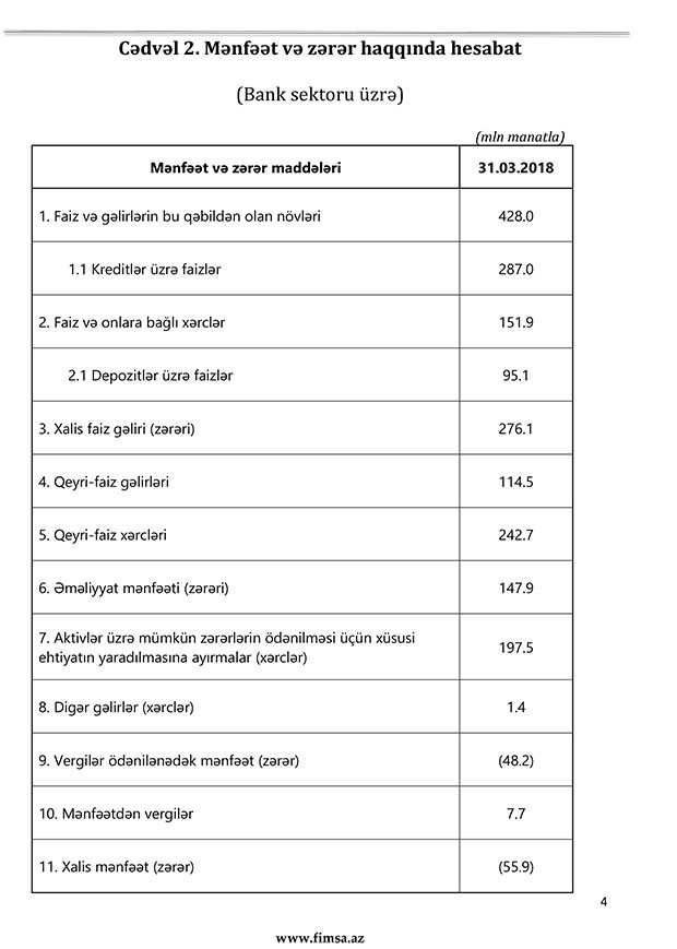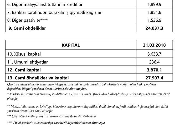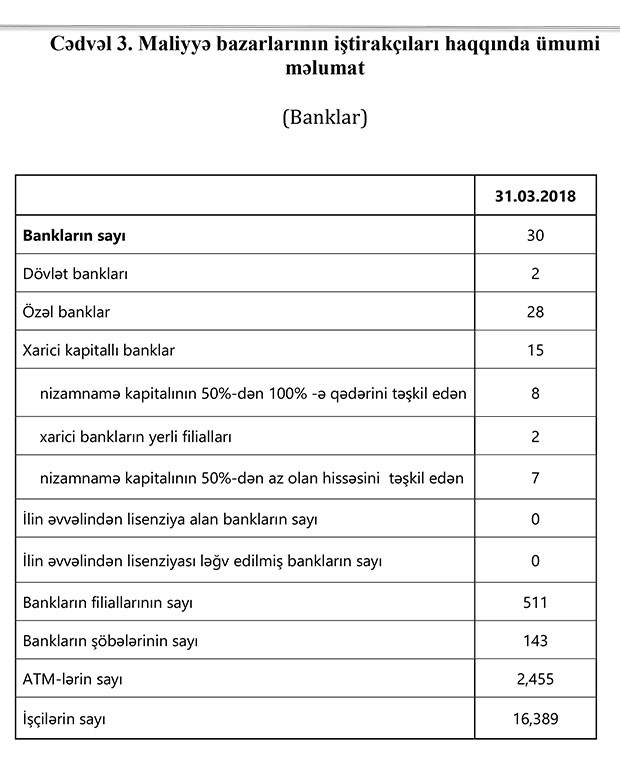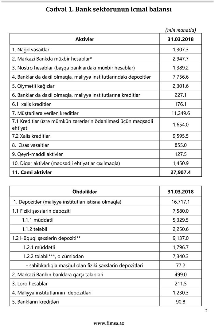 31 mart 2018-ci il tarixinə bank sektorunun əsas göstəriciləri bank sektorunun icmal göstəricilərində öz əksini tapıb.