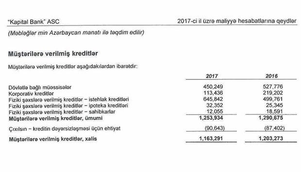 Ötən il “Kapital Bank”ın dövlətə bağlı müəssisələrə verdiyi kreditlər 77 milyon 527 min manat azalaraq 450 milyon 249 min manata, korporativ kreditlər 105 milyon 766 min manat azalaraq 113 milyon 436 min manata, sahibkar olan fiziki şəxslərə verilmiş kreditlər isə 6 milyon 536 min manat azalaraq 12 milyon 55 min manata düşüb.