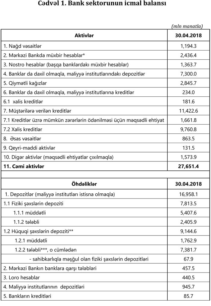 30 aprel 2018-ci il tarixinə Azərbaycanda fəaliyyət göstərən bankların cəmi aktivləri 27.7 mlrd. manat, cəmi öhdəlikləri isə 23.8 mlrd. manat təşkil edib.