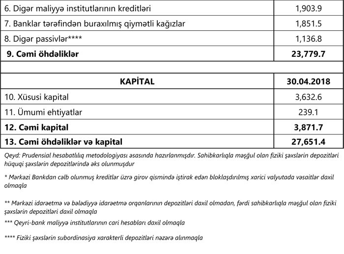 2018-ci ilin aprel ayı ərzində bank sektorunun aktivləri 0.9% (256 mln. manat), öhdəlikləri 1.1% (258 mln. manat) azalıb, kapitalı isə 0.04% (2 mln. manat) artıb.
