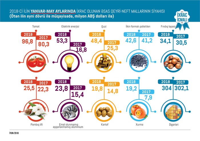 2017-ci ilin müvafiq dövrü ilə müqayisədə 2018-ci ilin ilk 5 ayında elektrik enerjisinin ixracı 3,2 dəfə, meyvə-tərəvəzin ixracı 23,3 faiz, alüminium və ondan hazırlanan məmulatların ixracı 20,4 faiz, pambıq ipliyi ixracı 15 faiz, kimya sənayesi məhsullarının ixracı 11,4 faiz artıb.