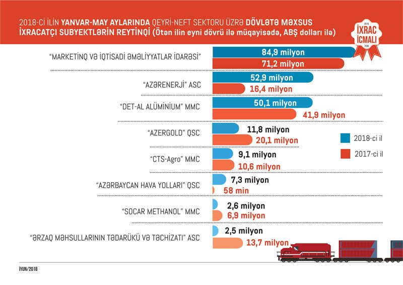 "Marja" İcmala istinadən xəbər verir ki, 2018-ci ilin yanvar-may aylarında qeyri-neft sektoru üzrə qeyri-dövlət ixracatçı şirkətlərin siyahısında ilk onluqda “Azərbaycan İnterneyşnl Mayninq Kompani Limited Şirkəti”nin Azərbaycan Respublikasındakı nümayəndəliyi, "MKT İstehsalat Kommersiya" MMC, "Baku Steel Company" MMC, "Kapitan Fruits" MMC, "Qala meyvə-tərəvəz ixracat idxalat" MMC, “Food Export Şəmkir” MMC, “Azfruittrade” MMC, “Şirin Aqro” QSC, "Sun Food" MMC, "Metalçılar-2" MMC təmsil olunub.