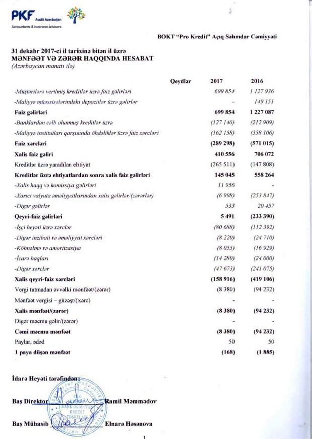 “Pro Kredit BOKT” ASC-nin qeyri-faiz gəlirləri isə 233 min 390 manatdan 5 min 491 manata geriləyib.