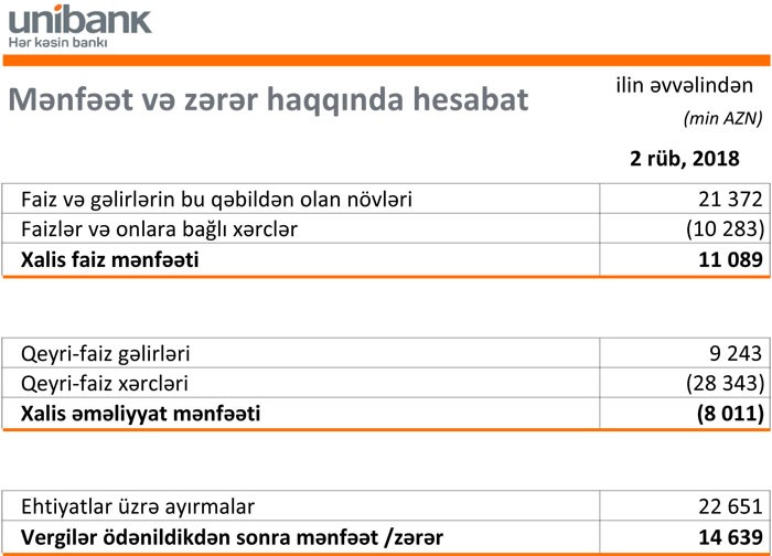 “Unibank” ASC ehtiyatlardan 22 milyon 651 min manat azad olması hesabına 2018-ci ilin birinci yarısını 14 milyon 639 min manat xalis mənfəətlə başa vurub. Ehtiyatların azad olması gecikmədə olan kreditlərin ödənildiyinə işarədir.