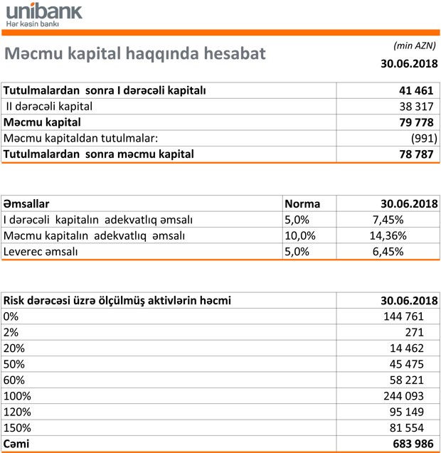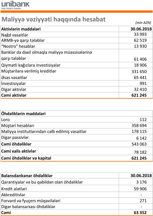 30 İyun 2018-ci il tarixində "Unibank" 621 milyon 245 min manat cəmi aktivlərə, 543 milyon 63 min manat cəmi öhdəliklərə və 63 milyon 352 min manat cəmi kapitala malik olub. 31 Dekabr 2017-ci il tarixində Unibank 601 milyon 841 min manat cəmi aktivlərə, 538 milyon 419 min manat cəmi öhdəliklərə, 63 milyon 422 min manat cəmi balans kapitalına malik idi. Aktivlərin artmasının səbəbi kreditlərin artçmasıdır.