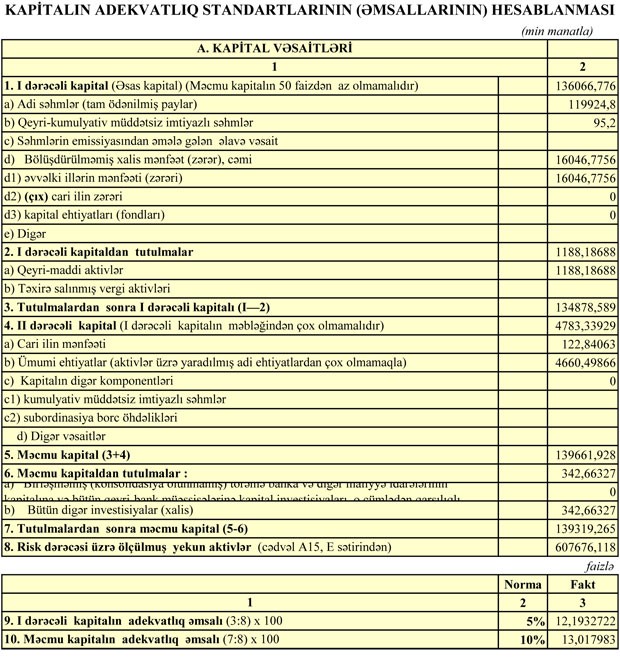 Bank 30 İyun 2017-ci il tarixində 609 milyon 875 min manat cəmi aktivlərə, 458 milyon 143 min manat cəmi öhdəliklərə və 151 milyon 731 min manat cəmi balans kapitalına malik idi.