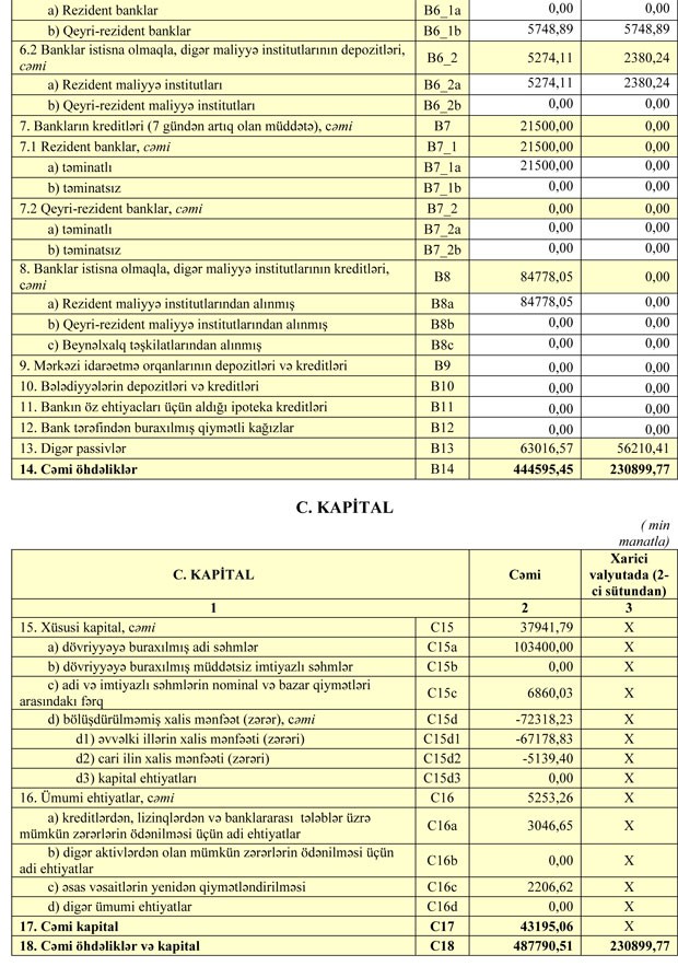 Zərər ilə əlaqədar olaraq Bankın cəmi kapitalı 47 milyon 174 min manatdan 43 milyon 195 min manatab düşüb.