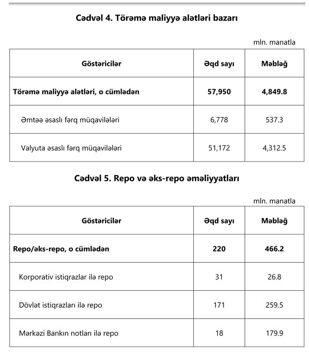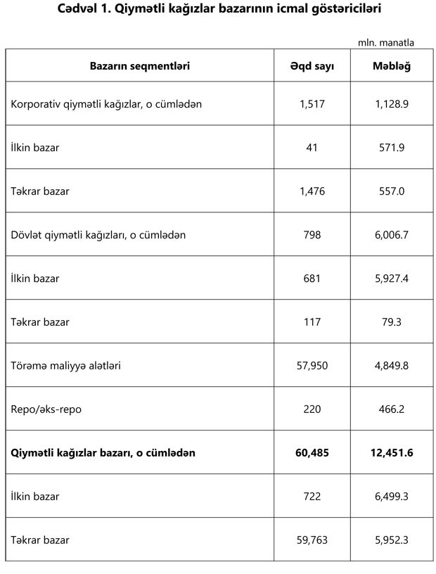 Maliyyə Bazarlarına Nəzarət palatasının yaydığı məlumata görə, əməliyyatların 52.2%-i (6 milyard 499 milyon manat) ilkin bazarda, 47.8%-i (5 milyard 952 milyon manat) isə təkrar bazarda aparılıb.