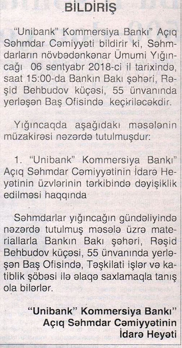 06 sentyabr 2018-ci il tarixində “Unibank” Kommersiya Bankı” ASC səhmdarların növbədənkənar ümumi yığıncağı keçiriləcəkdir.