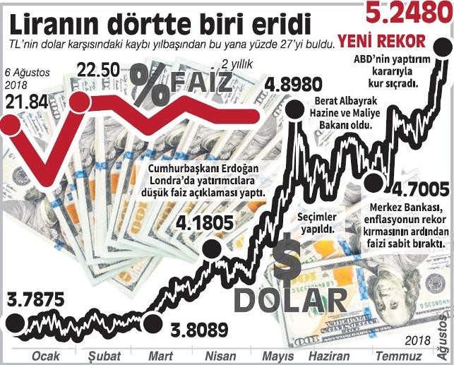 İki ölkənin (ABŞ və Türkiyə) qarşılıqlı sanksiya açıqlamasından sonra bazarlar da həftəyə gərgin başlayıb. TL təkcə dollara qarşı deyil, digər aparıcı valyutalar qarşısında da ucuzlaşıb. Avro/TL məzənnəsi 4.35 faiz yüksələrək 6.23 lirəyə çıxaraq rekord yeniləyib. Sterlinq/TL 3.4 faiz artımla 6.8448, İsveçrə Frankı 3.1 faiz artımla 5.3071 səviyyəsinə görüb. Dünən Dollar/TL-dəki gündəlik artım 4.5%-ə çatıb və məzənnə 5.42 səviyyəsini test edib. Türk Lirəsi dollar qarşısında 2018-ci ilin əvvəlindən bu yana 36% ucuzlaşıb. Lirə bu il dəyərinin dörddə birindən çoxunu itirib.