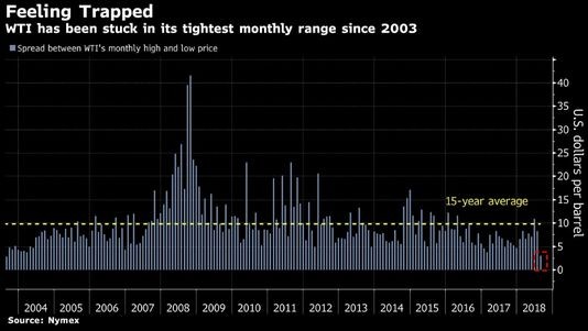ABŞ xam nefti Avqust ayının əvvəlindən bu yana 3 dollarlıq bir "dəhlizdə" ticarət olunub; Aylıq məlumatlara görə, bu, 2003-ci ildən bu yana qeydə alınan ən dar "dəhlizdir".