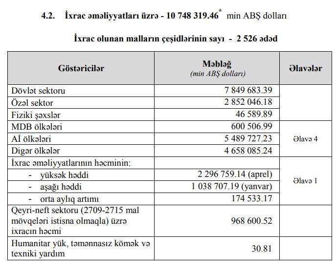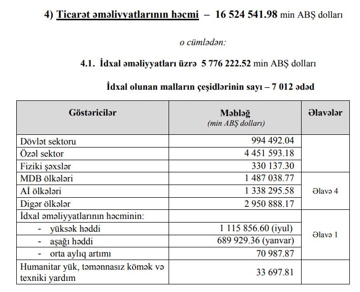 “Marja” Dövlət Gömrük Komitəsinin hesabatına istinadən xəbər verir ki, idxal əməliyyatları üzrə 5 milyard 776 milyo 222.52 min ABŞ dolları, ixrac əməliyyatları üzrə 10 milyard 748 milyon 319.46 min ABŞ dolları ticarət qeydə alınıb. Saldo müsbət 4 milyard 972 milyon dollar olub.