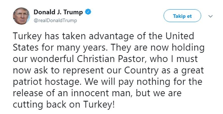Tramp sosial mediadan etdiyi açıqlamada, "Türkiyə uzun illər ABŞ-dan istifadə etdi. İndi, ölkəmizi böyük bir vətənpərvər olaraq təmsil edən möhtəşəm biri keşişimizi həbsdə saxlayırlar. Günahsız bir adamın sərbəst buraxılması üçün heç nə verməyəcəyik, Türkiyə ilə əlaqələrimizi azaldırıq",- İfadələrini istifadə edib.