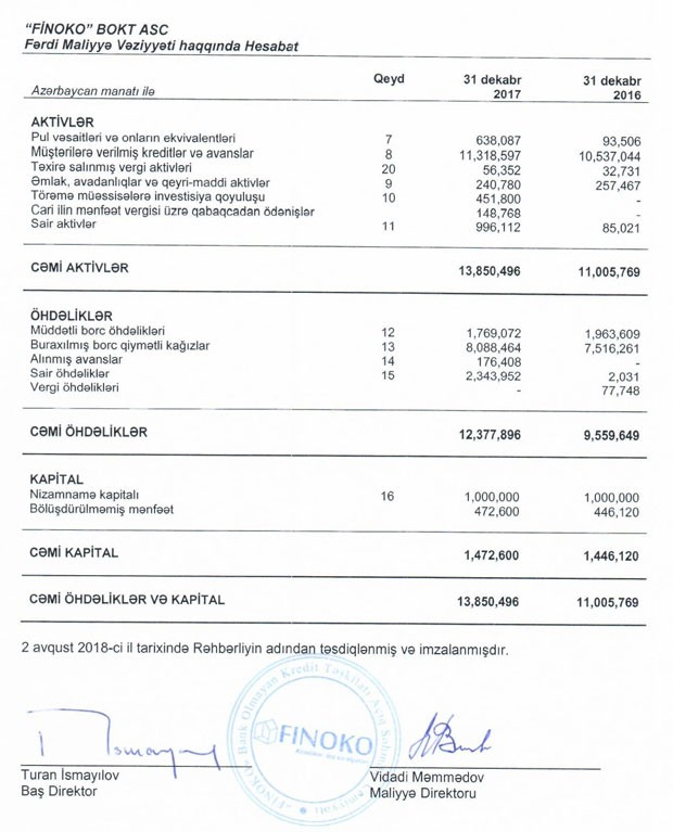 “FİNOKO” BOKT ASC 2017-ci ili 26 min 480 min manat xalis mənfəətlə başa vurub.