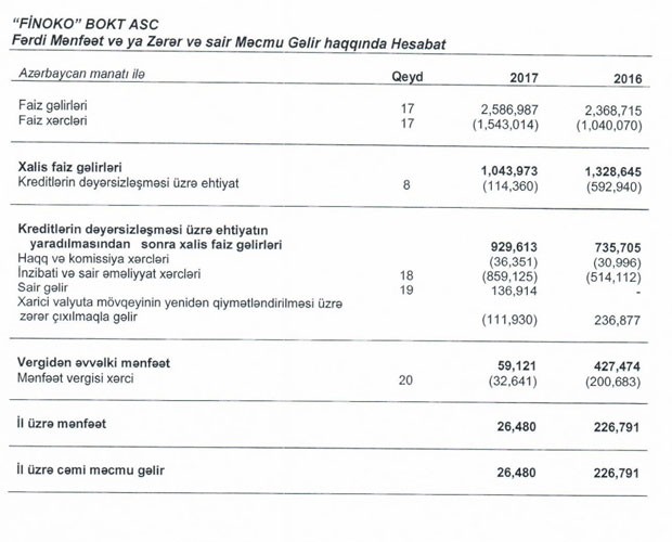 Ötən il 2016-cı illə müqayisədə “FİNOKO”nun faiz gəlirləri 9,2% artaraq 2 milyon 587 min manata qalxıb. Faiz xərcləri, inzibati və digər əməliyyat xərcləri kəsin artdığından vergidən əvvəlki mənfəət 427,5 min manatdan 59 min manata düşüb. Ötən il təşkilat 32 min 641 manat mənfəət vergisi ödəyib.