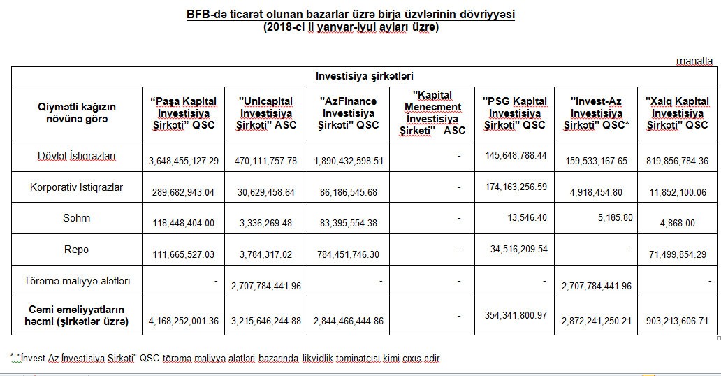2018-ci il yanvar-iyul ayları üzrə Bakı Fond Birjasında (BFB) ticarət olunan bazarlar üzrə birja üzvlərinin dövriyyəsi açıqlanıb.