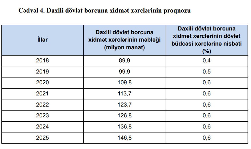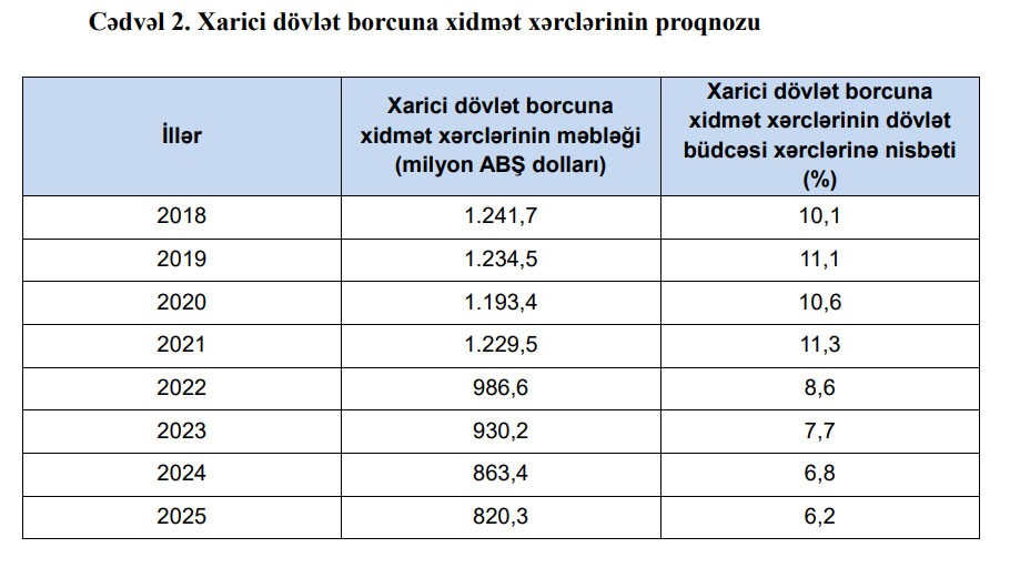 “Marja” “Azərbaycan Respublikasında dövlət borcunun idarə edilməsinə dair orta və uzun müddət üçün Strategiya”ya istinadən xəbər verir ki, bu il ümumi dövlət borcuna xidmət xərclərinin məbləğinin 1 milyard 294,5 milyon dollar təşkil edəcəyi gözlənilir. Bu xərcin 2021-ci ildək hər il azalacağı, 2021-ci ildə yenidən artaraq 1 milyard 296,3 milyard dollara qalxacağı və 2025-ci ildə isə 906,5 milyon dollara düşəcəyi proqnozlaşdırılır.