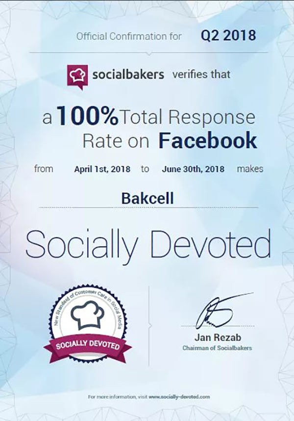 Xüsusi analitik platforma vasitəsilə dünya üzrə məşhur şirkətlərin sosial şəbəkələrdəki fəaliyyətinin monitorinqi ilə məşğul olan tanınmış “Socialbakers” şirkəti Azərbaycandakı şirkətlərin “Facebook” şəbəkəsində 2018-ci ilin II rübü üzrə fəaliyyətlərini nəzərdən keçirib. Həmin monitorinqin nəticələrinə əsasən, göstərilən müddət ərzində Bakcell şirkəti özünün rəsmi “Facebook” səhifəsinə daxil olmuş müraciətlərin 100%-ni cavablandırıb. Qeyd edək ki, Bakcell şirkəti 2018-ci ilin birinci rübü ərzində də abunəçi sorğularının 100%-ni cavablandıraraq göstərdiyi yüksək nəticəyə görə xüsusi sertifikatla təltif olunmuşdur. Həmçinin, 2017-ci ildə “Bakcell” dörd dəfə “Socially Devoted” sertifikatına layiq görülüb. “Bakcell”in “Facebook” səhifəsinin 400 mindən artıq istifadəçisinin olması bu nailiyyəti daha da vacib və təqdirəlayiq edir.