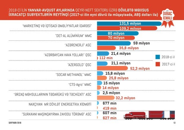 “Marja” xəbər veri ki, “İxrac İcmalı”nın sentyabr sayında qeyri-neft sektoru üzrə əsas ixracatçı subyektlərin reytinqi də verilib.