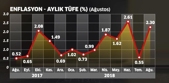 İstehlakçı qiymətləri indeksi (inflyasiya) Avqust ayında aylıq 2.30%, illik 17.90% artmışdı. İllik artım 15 ilin ən yüksək səviyyəsi idi.