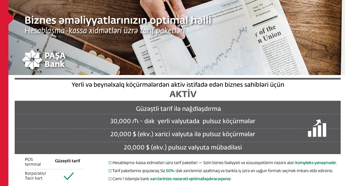 Ödəniş və digər bank əməliyyatlarınızı banka gəlmədən asan icra etmək üçün 3 illik Korporativ/Tacir kart və PAŞA Bank-ın sürətli internet bank xidmətinə qoşulma hədiyyə edilir.