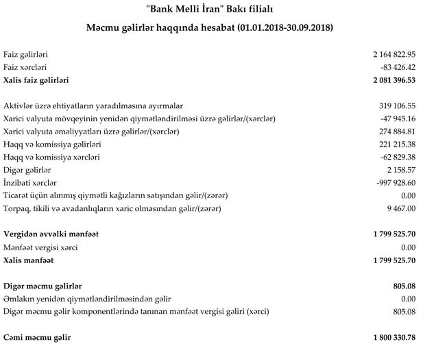 “Marja” Bankın maliyyə hesabatına istinadən xəbər verir ki, cari ilin yanvar-sentyabr dövründə "Bank Melli İran" Bakı filialının faiz gəlirləri 2 milyon 164 min manat, haqq və komissiya gəlirləri gəlirləri 221 min 215 manat, xarici valyuta əməliyyatları üzrə gəlirlər isə 275 min manat təşkil edib.