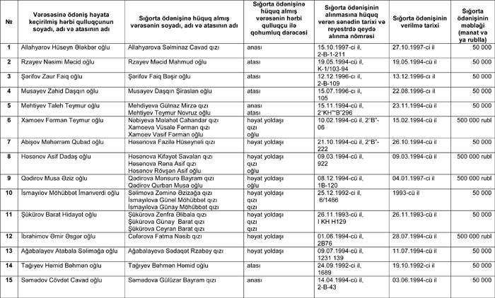Xatırladaq ki, şəhid hərbi qulluqçuların dəqiqləşdirilmiş siyahısı üzrə nazirliyin saytında (www.mlspp.gov.az) “Birdəfəlik ödəmə” bölməsində şəhid hərbi qulluqçunun adı, soyadı və atasının adı qeyd olunmaqla, sorğu verilir və şəhid hərbi qulluqçunun vərəsəsinin (vərəsələrinin) birdəfəlik ödəməni almaq hüququnun olub-olmadığı barədə məlumat əldə olunur.