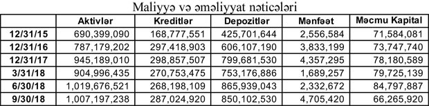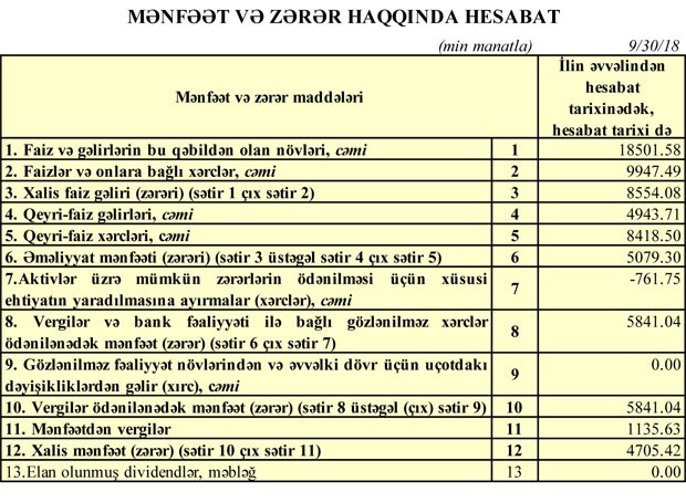 Cari ilin 9 ayı ərzində Bank 23 milyon 445 min manat cəmi gəliri əldə etmək üçün 18 milyon 366 min manat xərc çəkib. Nəticədə, Bankın 5 milyon 79 min manat əməliyyat mənfəəti yaranıb.